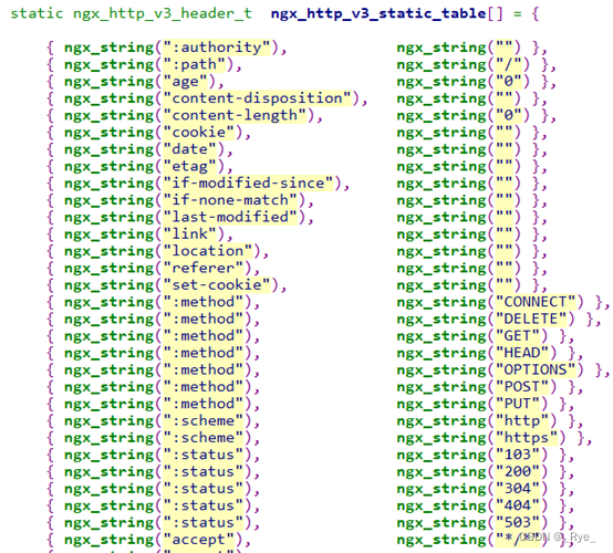 而在 QPACK 中,则上升为 98 个静态表项,比如 Nginx 上的 ngx_http_v3_static_table 数组所示: