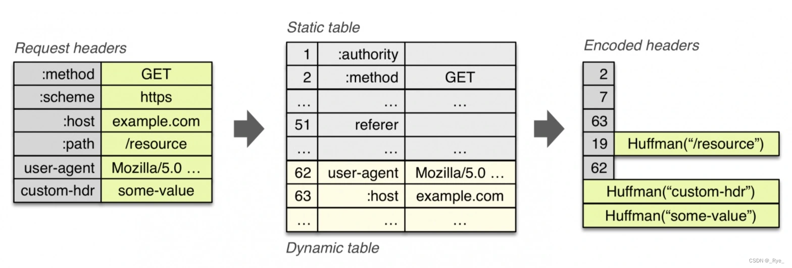 与 HTTP/2 中的 HPACK 编码方式相似,HTTP/3 中的 QPACK 也采用了静态表、动态表及 Huffman 编码: