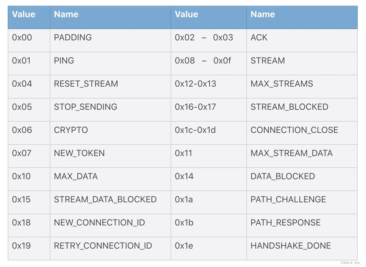 前 4 个字节的 Frame Type 字段描述的类型不同,接下来的编码也不相同,下表是各类 Frame 的 16 进制 Type 值: