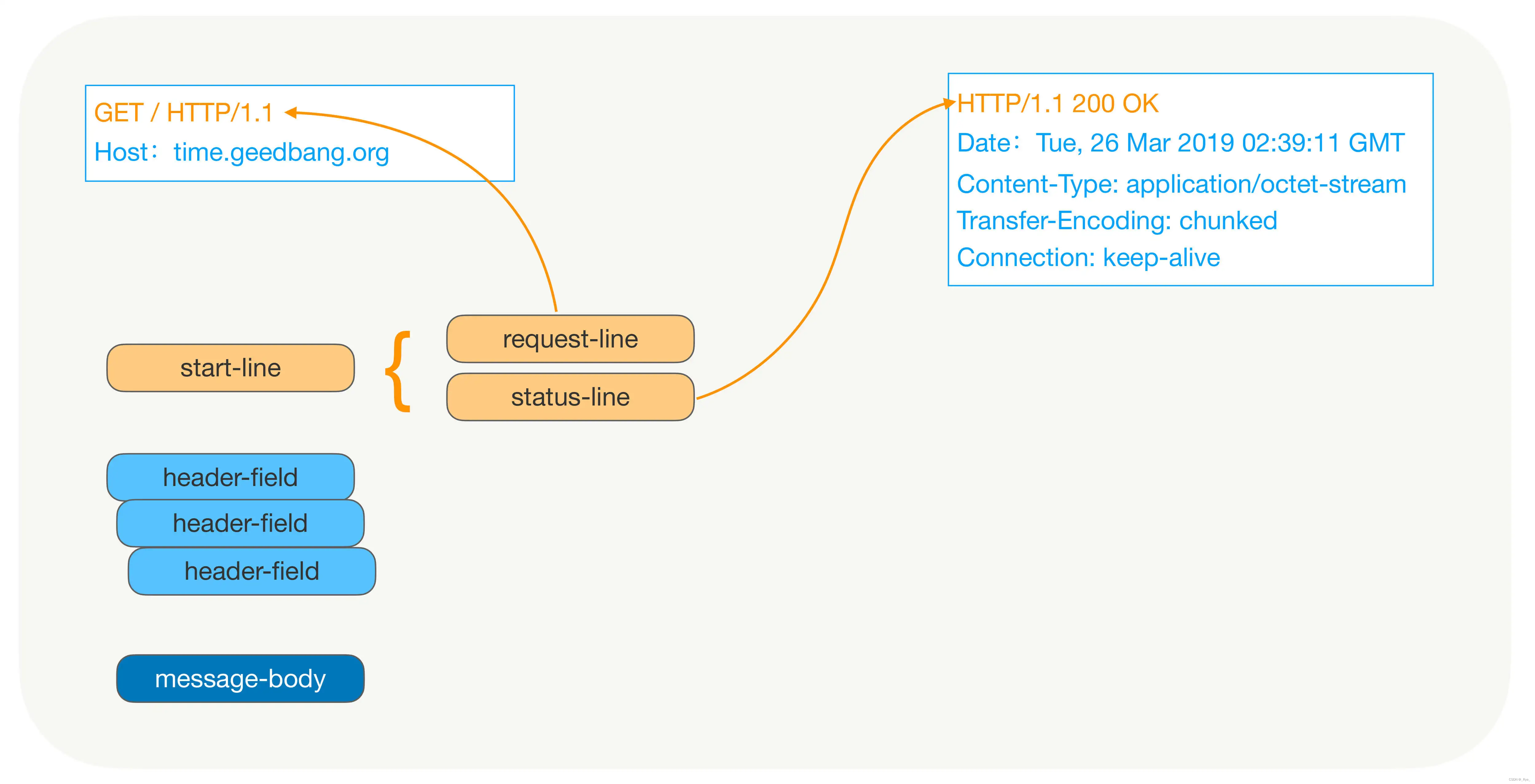 请求与响应都由 Header、Body(可选)组成,其中请求必须含有 URL 和方法,而响应必须含有响应码;