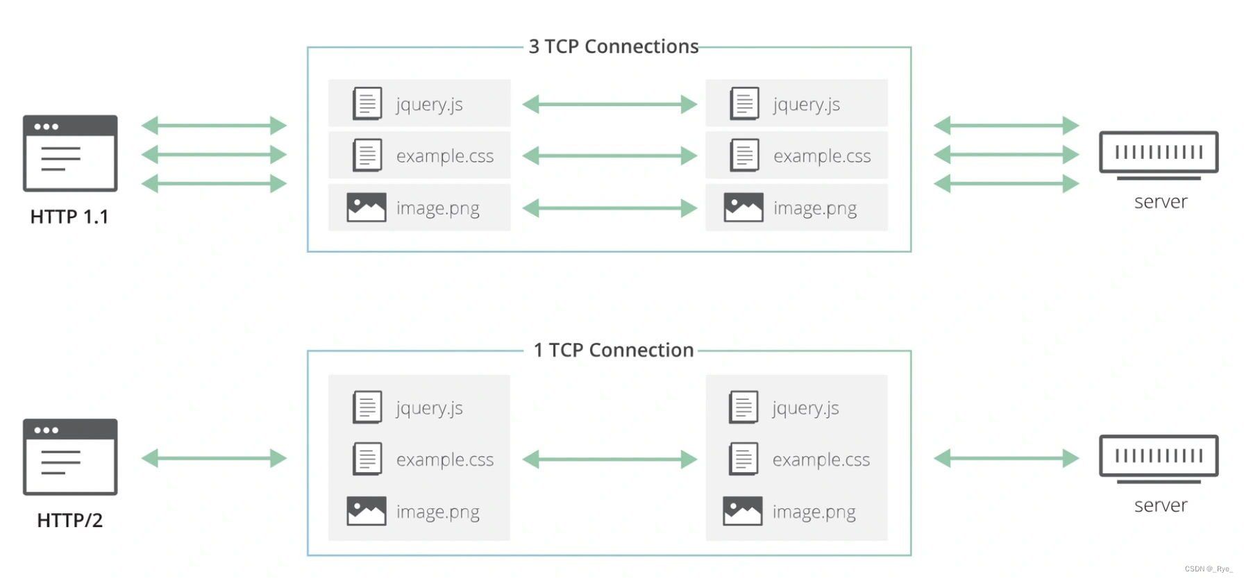 因此,HTTP/2 与 HTTP/3 都在应用层实现了多路复用功能: