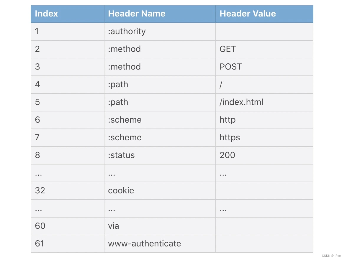 先来看静态表的变化。在上图中,GET 方法映射为数字 2,这是通过客户端、服务器协议实现层的硬编码完成的。在 HTTP/2 中,共有 61 个静态表项: