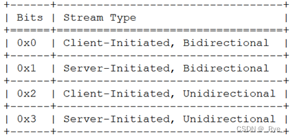 这里我们又引入了单向 Stream 和双向 Stream 概念,不要头疼,它其实很简单。单向指只有一端可以发送消息,双向则指两端都可以发送消息。还记得上一小节的 QUIC Stream Frame 头部吗?其中的 Stream ID 别有玄机,除了标识 Stream 外,它的低 2 位还可以表达以下组合: