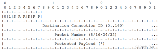 建立连接时,连接是由服务器通过 Source Connection ID 字段分配的,这样,后续传输时,双方只需要固定住 Destination Connection ID,就可以在客户端 IP 地址、端口变化后,绕过 UDP 四元组(与 TCP 四元组相同),实现连接迁移功能。下图是 Short Packet Header 头部的格式,这里就不再需要传输 Source Connection ID 字段了: