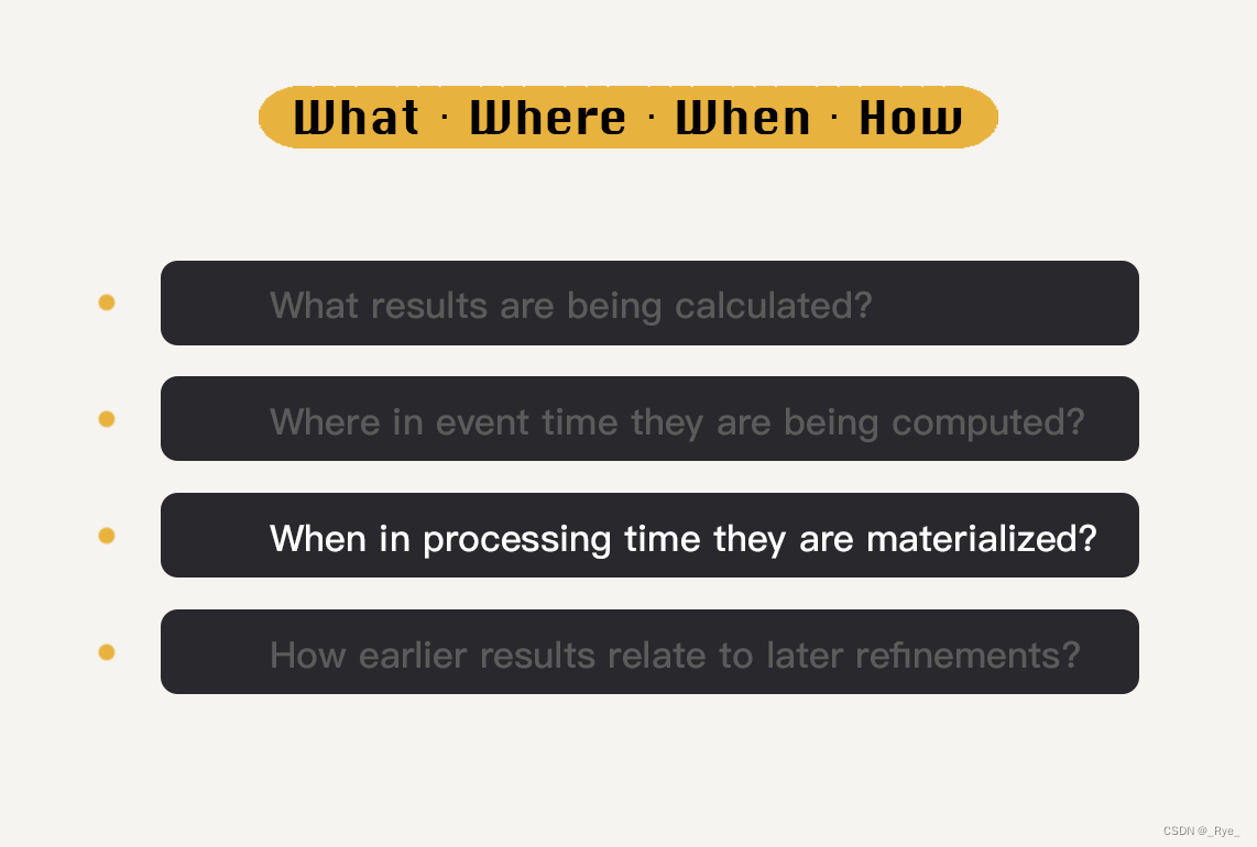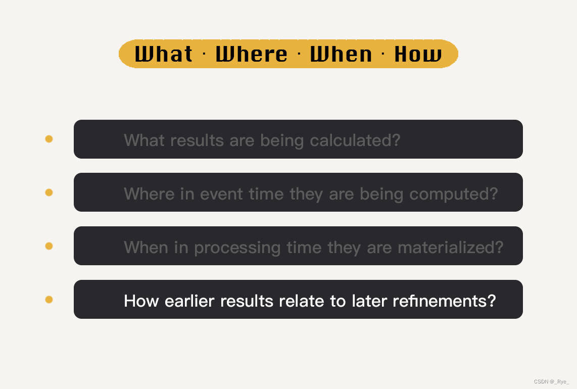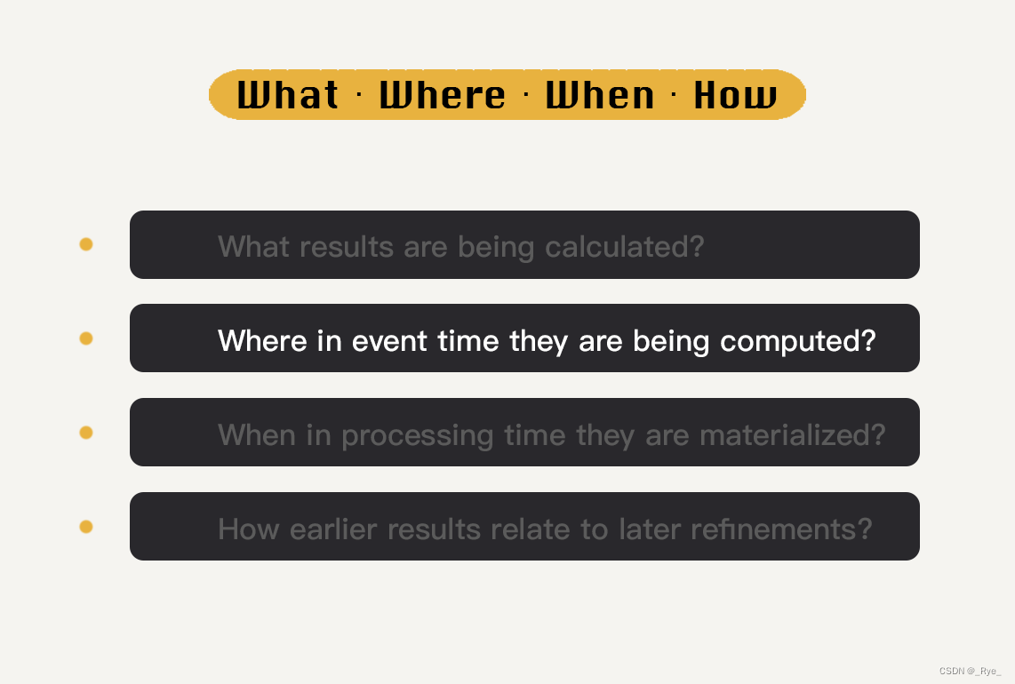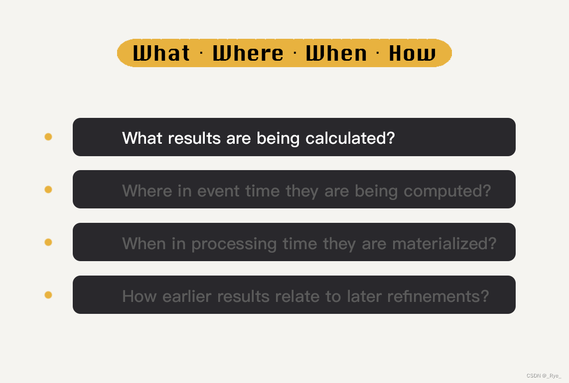 懂得了这几个概念之后,我来告诉你究竟 Beam 编程模型中的“WWWH”是什么。它们分别是:What、Where、When、How。