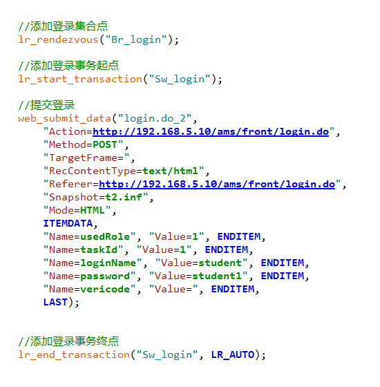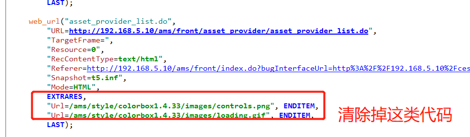 在录制脚本后,产生大量脚本代码,我们需要清理web_url()方法中的EXTRARES与LAST之间的代码。