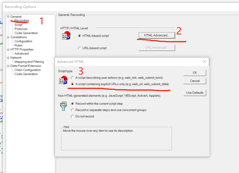 脚本录制过程中会录制多余用户操作,所以我们在Recording Options --- General --- Recording --- HTML Advanced... 按钮中选择Script type中第二个单选按钮。