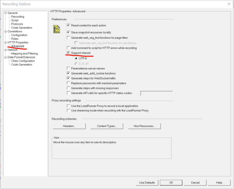 Loadrunner在录制脚本前,需查看服务器访问网址编码格式,在确定网页格式后,在Recording Options中进行相应的设置。