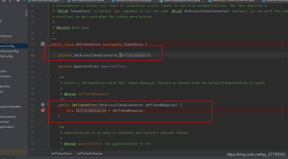 如果是JwtTokenStore存储的话可以直接进入该类中,当前这个类中并没有操作时间的,我们可以看到它有两个属性,我们先进入第一个属性进入该类