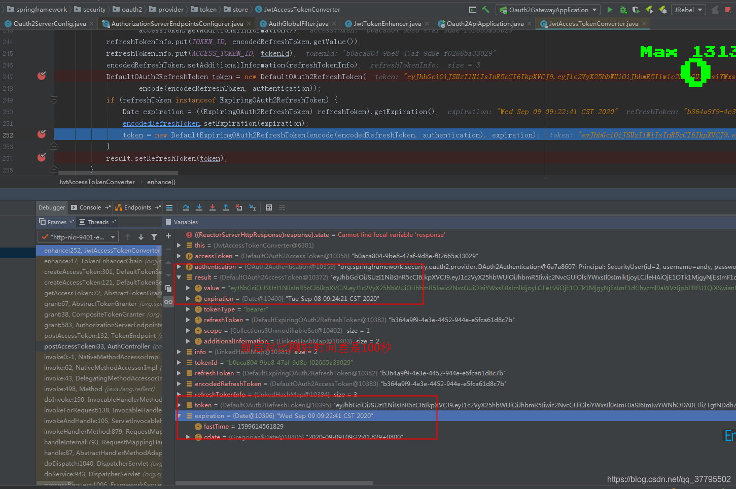 其中在配置授权服务器断点时会配置令牌的存储:tokenStore(tokenStore) ,这个令牌存储中会存令牌的过期时间,cliend_id,name等信息,一般默认使用InMemoryTokenStore()存储。我们可以在AuthorizationServerEndpointsConfigurer类中查看区别判断token的存储代码逻辑