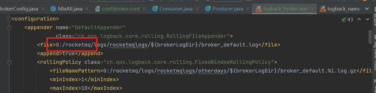 logback_broker.xml和logback_namesrv.xml文件中的${user.home}替换成项目的路径,这样模块启动的日志才会到logs文件夹下。