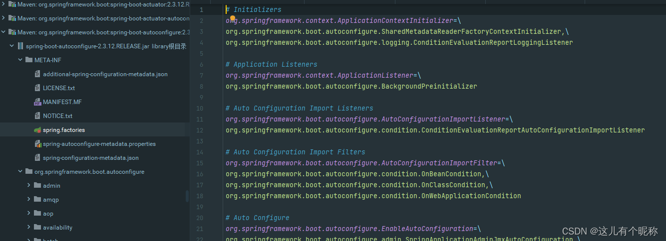 可以参考springframework配置,这样当我们引入这个包的时候就默认去获取spring.factories里面的配置信息,这样的好处我们就无需在启动类上手写相关配置,比较简便。需要注意的是这个属于全局的,一旦配置,你的服务子服务也会引入。可能会引入一些不需要的功能,还需要看自己的取舍