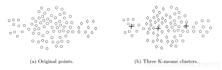 在这个例子中,K-means找不到三个自然聚类,因为其中一个聚类比另外两个聚类要大得多。