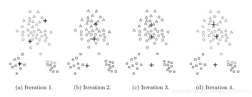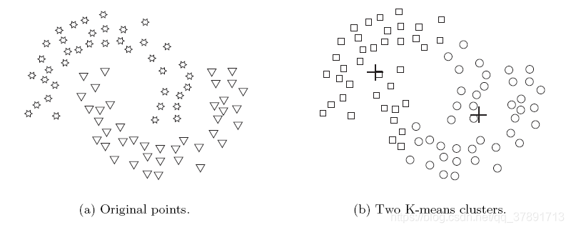 在该示例中,K-means找到两个群集,其混合两个自然群集的部分。