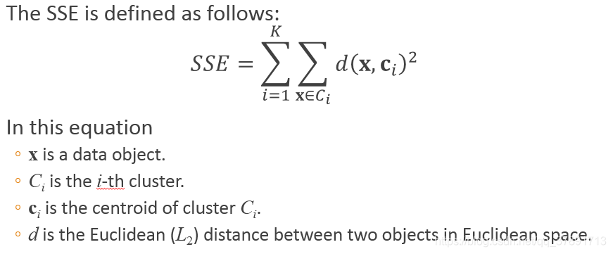 对于测量聚类质量的目标函数,我们可以使用平方误差之和(SSE)。