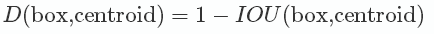 YOLO v2对Faster R-CNN的手选先验框方法做了改进,采样k-means在训练集bbox上进行聚类产生合适的先验框.由于使用欧氏距离会使较大的bbox比小的bbox产生更大的误差,而IOU与bbox尺寸无关,因此使用IOU参与距离计算,使得通过这些anchor boxes获得好的IOU分值。距离公式:![]()