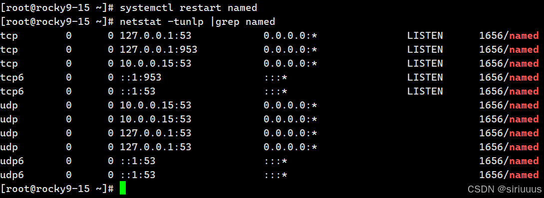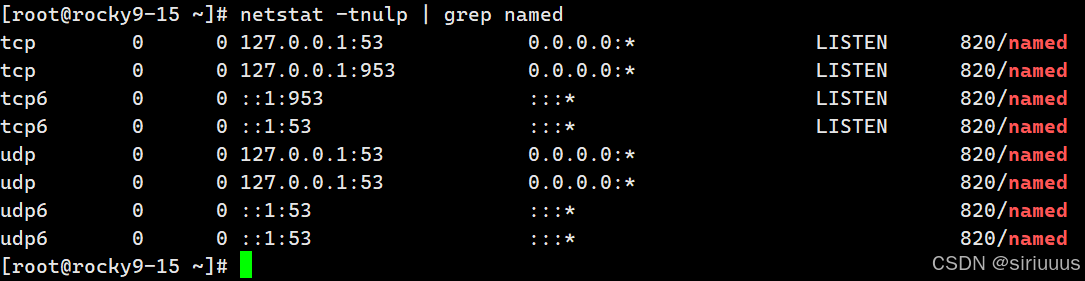 查看端口占用情况(named 默认会占用 TCP 和 UDP 的 53 端口, 953 是给 rndc 管理工具使用的)