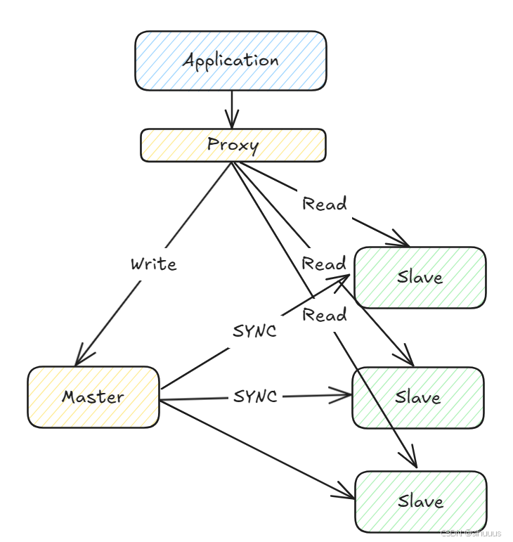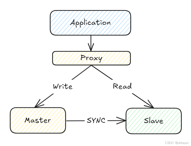 依赖于 MySQL 服务的应用程序连接代理,代理将应用程序的写操作分发到 Master 节点,将读操作分发到从节点,如果有多个从节点,还可以根据不同的调度算法来进行分发。