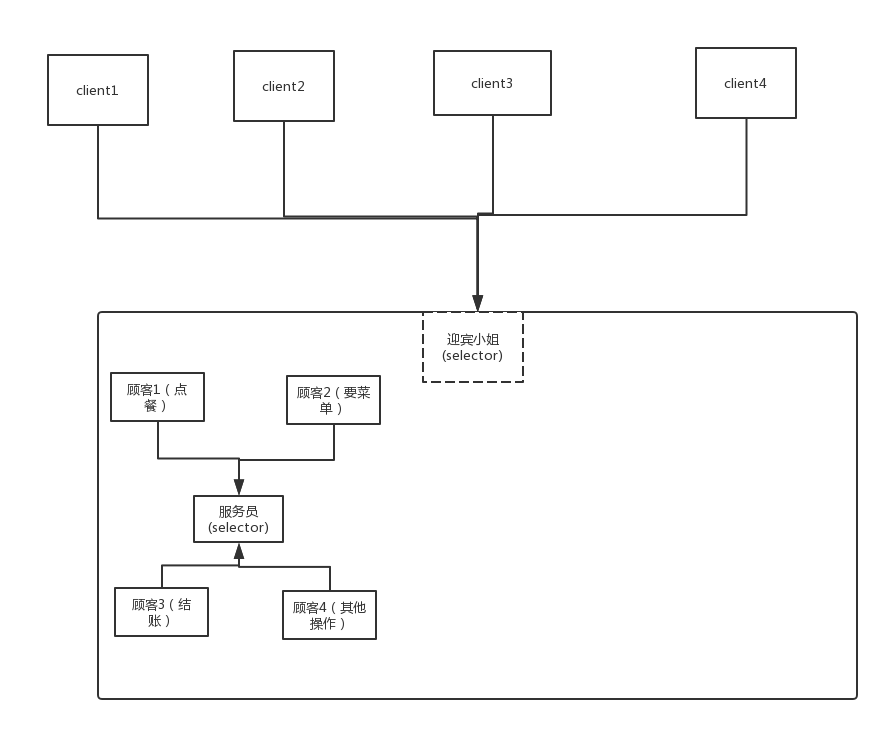 使用了nio我们会将各种读写时间,和链接事件都交给selector管理。绑定类型(例如SelectionKey.OP_ACCEPT,注accpet是请求接收类型,connect是已接收类型)使得listen()知道client 要进行哪种操作。这4个顾客发起任何类型请求都会注册到selector中listen()中 ,死循环取得多路复用器中的事件(selector.select())就相当于一个服务员给多个顾客服务,即取得顾客放入selector中的请求。 我们在上面的代码中设置时间(有个注解叫设置时间的),使得程序非阻塞。实际上如果顾客1的点餐请求花费时间太长的话,还是会阻塞其他顾客的请求的。这只是初步了解。之后还要更新