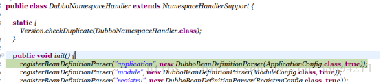这个里面的init()方法中 会把各种标签都交给DubboBeanDefinitionPaser 处理,每一个标签就会掉对应的’elementName’方法一次,这里elementName的意思是图上registerBeanDefinitionParser()方法的第一个参数。这里经过老师的讲解,觉得这里做的不好,因为全部交给DubboBeanDefinitionParser来做的话里面会有很多的判断。