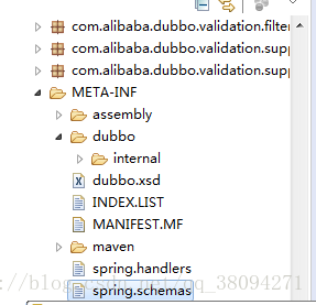首先,根据dubbo 自定义的继承于namespacehandlesupport 将会去解析 dubbo xml 里面的各个标签。 为什么会提交给namespacehandlesupport 呢?准确的说应该是dubbonamespacehandle 。 因为在dubbo的jar 包下面有个META-INF 下面有个spring.handlers 和spring.schemas, handler 里面写着交给哪个类去处理,schemas 顾名思义是标签的规则。