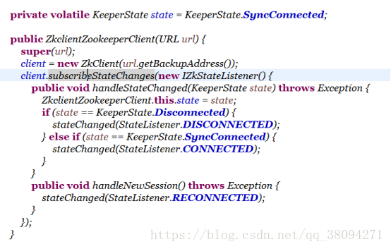 这边 很明显匿名内部类,clientsubscribeStateChange 会把这个监听器放入zkClient 的 一个Set 中,这个Set 专门用来存储注册进来的监听器。stateChanged 方法执行后会遍历Set,每个监听器都调用他的statechanged方法 handlenewSession 说明session 不一样了, 那不就是断了要重新连了么, statechanged 方法就会调到上上图的recover方法。我们回到进来的refer方法,往下走doRefer。