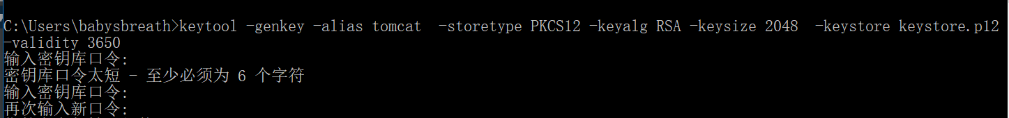 keytool -genkey -alias tomcat -storetype PKCS12 -keyalg RSA -keysize 2048 -keystore
