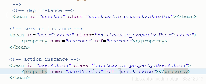 新手在入门学习Spring时遇到一个问题,就是关于Spring的配置xml中的<bean>里的<property>l的name和ref虽然是同名的但是name是指UserAction类中引入的参数userService,,而ref是代表当前xml文件中叫做userService的这个bean