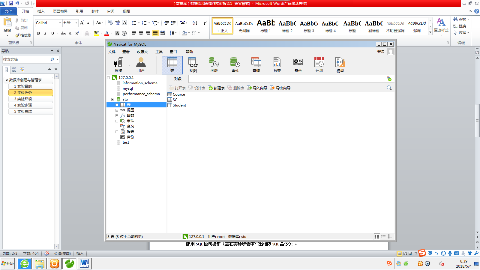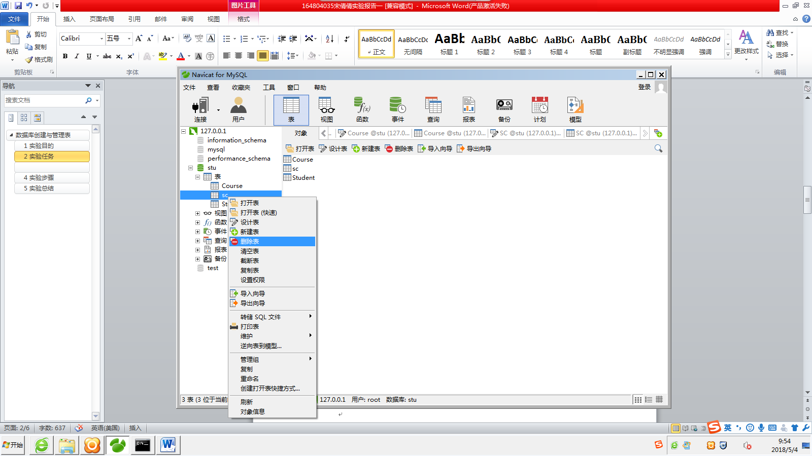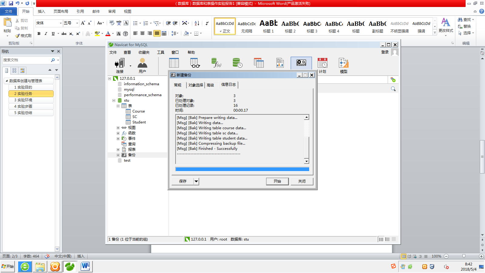本次实验涵盖了MySQL数据库的创建、管理及表的操作,包括使用Navicat创建和删除数据库,创建并填充student、course、score表,以及数据库的备份与恢复。实验总结强调了实践的重要性,以及学习到的数据库基本操作。
