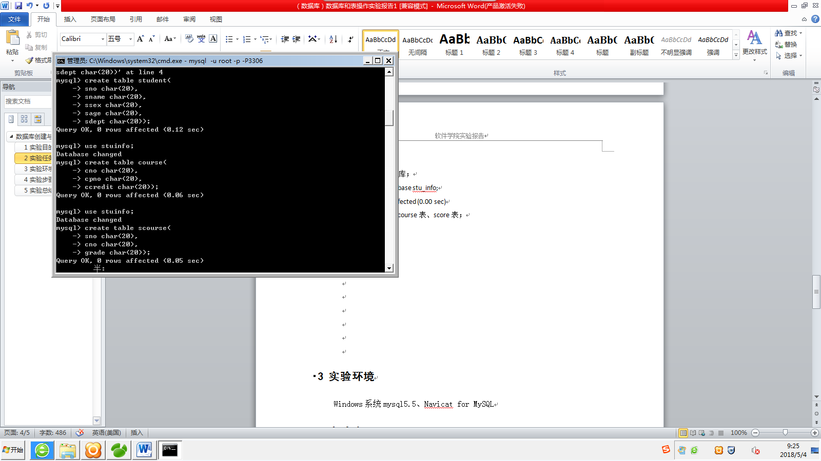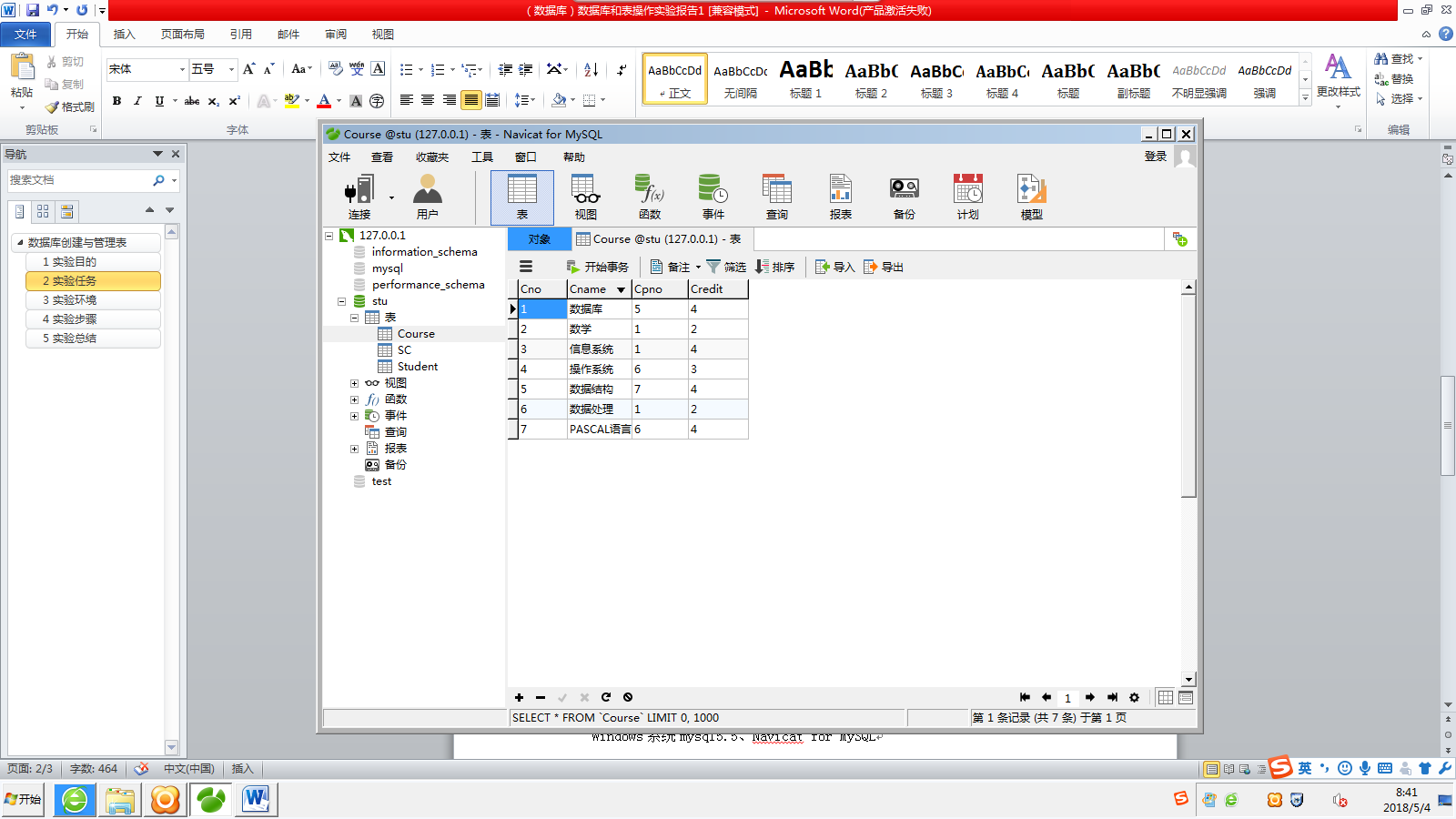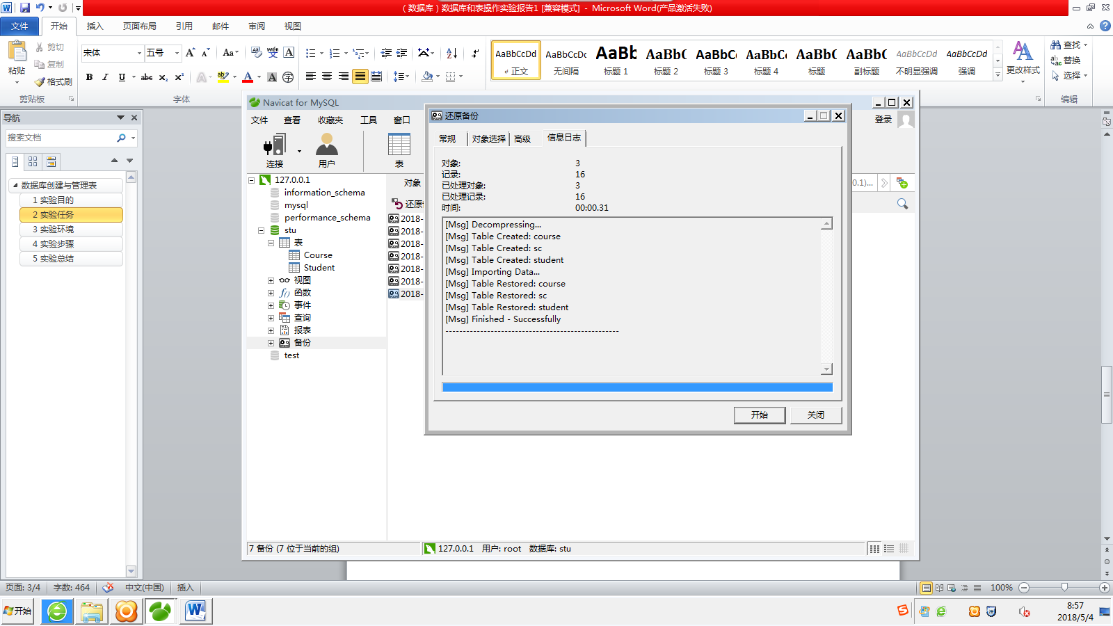 本次实验涵盖了MySQL数据库的创建、管理及表的操作,包括使用Navicat创建和删除数据库,创建并填充student、course、score表,以及数据库的备份与恢复。实验总结强调了实践的重要性,以及学习到的数据库基本操作。