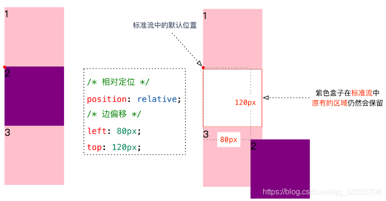 相对定位 相对定位占据位置,按照正常标准流显示,后面的盒子按照正常显示