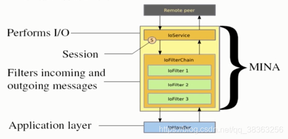 这张图是双向的,我们从上往下看,首先 Remote peer代表我们的远程服务器,与我们的客户端通过IoService建立连接以后就会得到一个Session,然后我们的Session将我们的数据传递给IoFilterChain(过滤链)中,然后过滤链将数据过滤直到将符合条件的数据传递给Application layer里,我们的客户端要做的是在IoHandler中完成对数据的操作,更新UI/保存数据库
