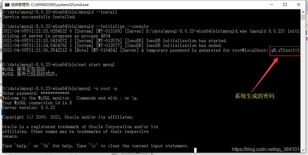 初始化 mysqld --initialize --console,注意保存生成的密码 qN,zYfznt1=l