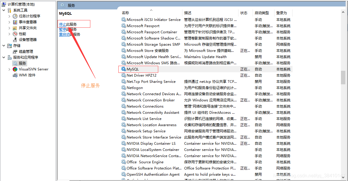 首先关闭服务,此电脑右键->管理->服务和应用->服务,找到MySql,停止服务。