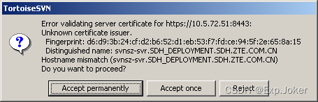 注意:首次访问SVN库时,会出现如下提示,选择“accept permanently”,以后就不会出现提示了。