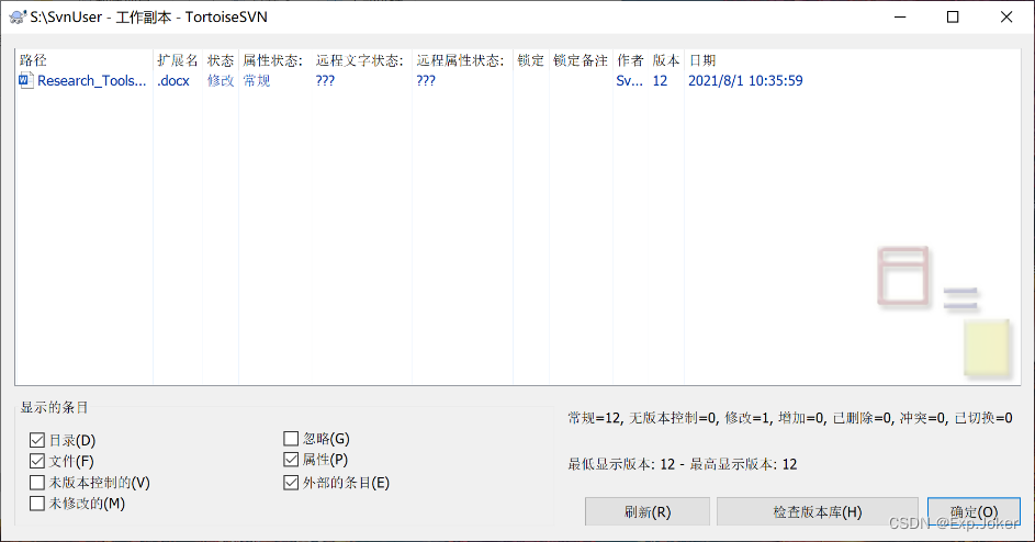 这个时候如果我们用右键点击这个 Working Copy的顶级目录,并在上下文菜单中选择 TortoiseSVN->Check for Modification,就会看到这个 Working Copy中都有哪些变化,如下图。
