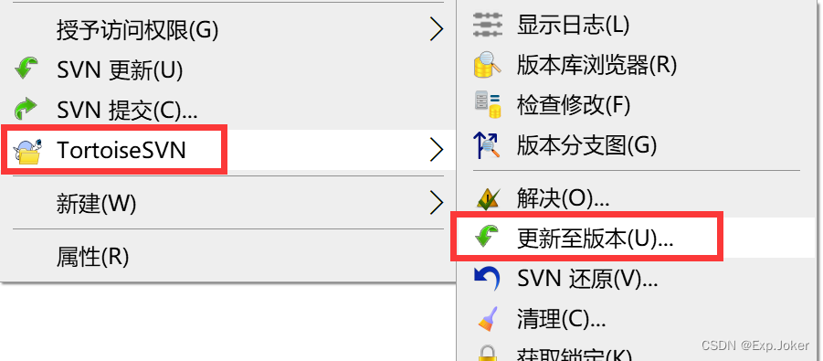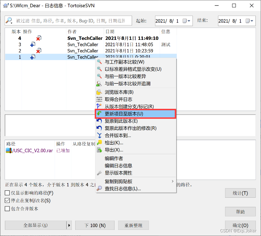 如下图选取“1”版本号,右击选择update item to revision再认证一次,即可在工作拷贝中获取版本为“1”的内容。