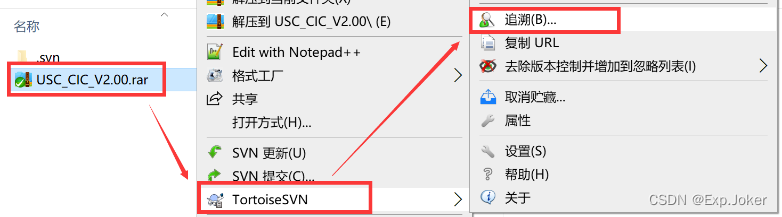 追溯是为了精确地知道谁修改了一个文件中的哪一行。选择文件后右击TortoiseSVN → Blame命令。