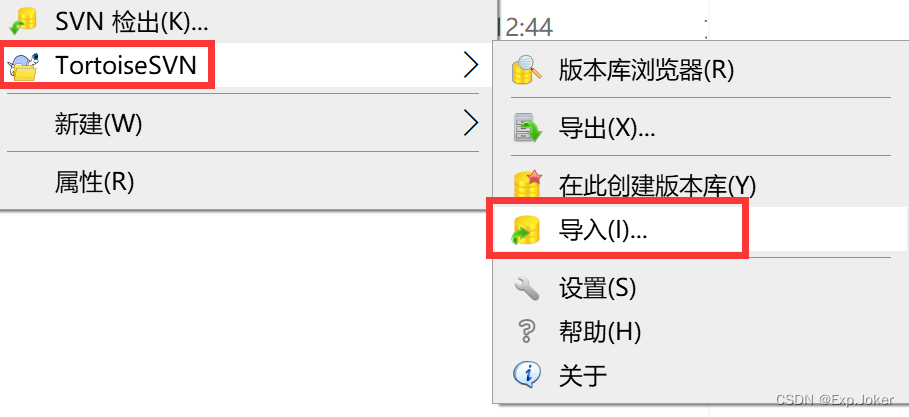 此命令用于上传文件(注:只能上传文件夹)。如果你想把本地的文件或文件夹添加到服务器上的某个目录下面(注意此目录需是空目录),那么在本地的目录处右击TortoisrSVN-import,如下图: