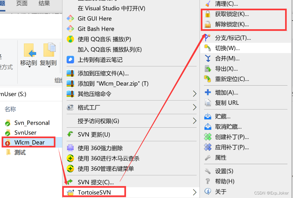 解锁操作:选择锁定的文件或目录,右击TSVN->选择子菜单“Release Lock”,选定解锁的文件,点击确定。