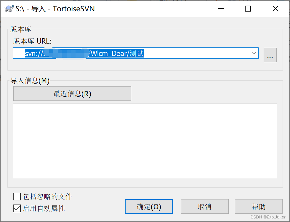在URL of repository输入要上传到的库的地址,message一定要写,为了将系统默认忽略的文件全部上传到服务器,需要勾选“include ignored files”。