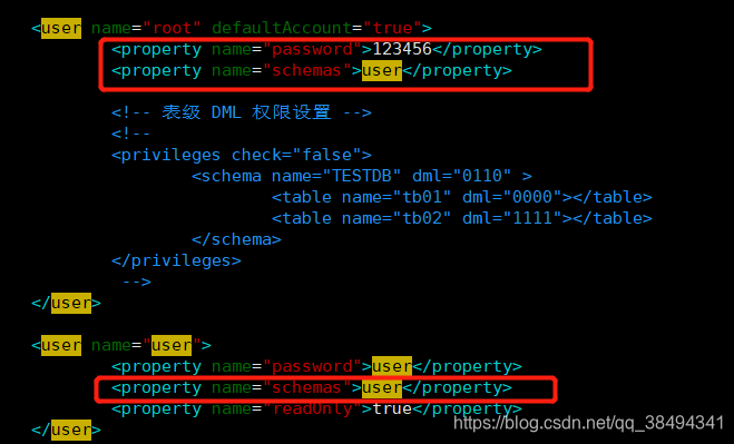 修改root的密码,和schemas的逻辑库,也修改user账户的逻辑库