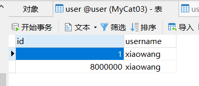 在MyCat中插入两条数据,可以看到,两台数据根据配置的规则分别插入到了两个库中。