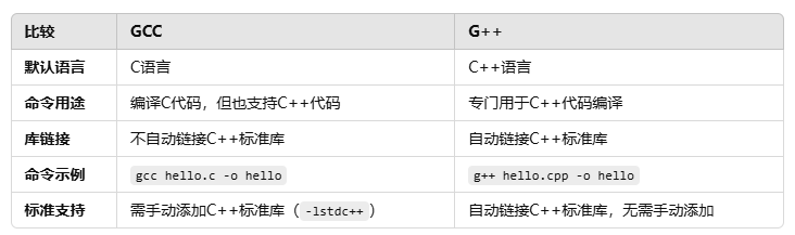 G++是GCC的C++编译器部分,专门用于编译C++代码。与GCC相比,G++默认启用C++特性,比如支持C++标准库和面向对象编程。