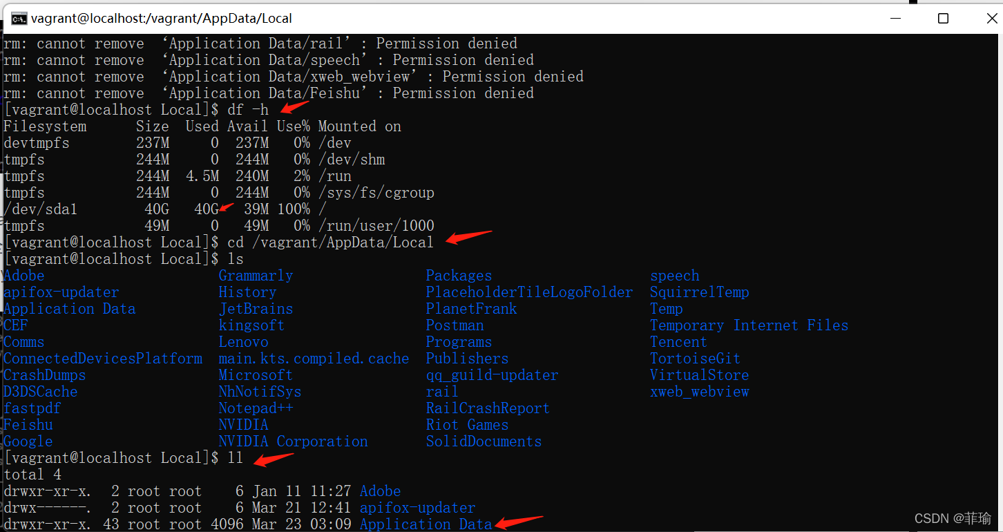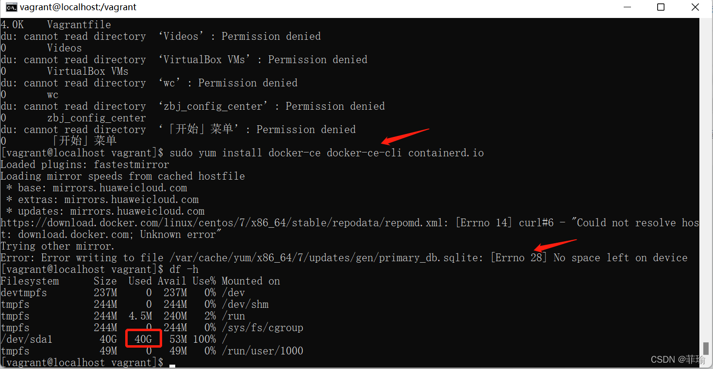 今天vagrant安装docker,出现报错[Errno 28] No space left on device,空间被使用完了,通过命令df -h命令,发现/dev/sda1用了40G,因为之前vagrant安装centos时,发现Application Data目录一直下在东西