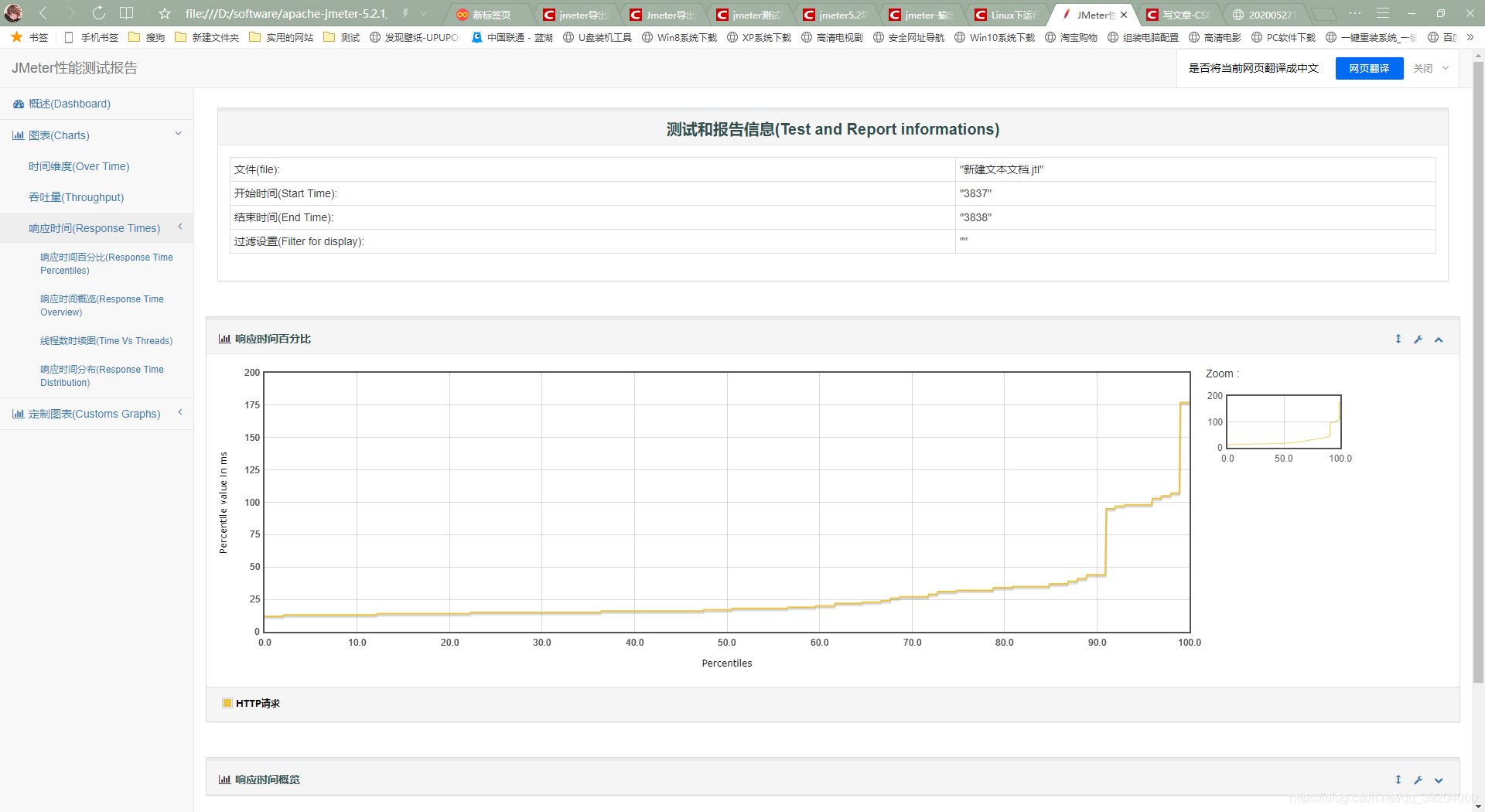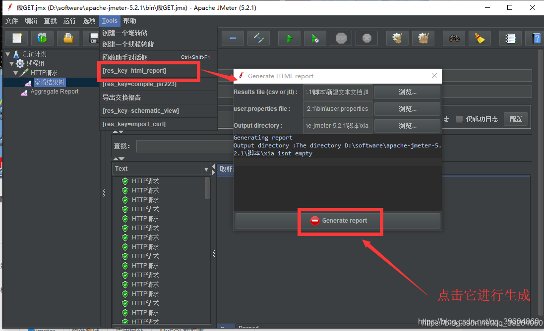 3.点击generate report 按钮进行生成测试报告,(PS:报告导出的文件夹下文件需要为空,不然会报错)