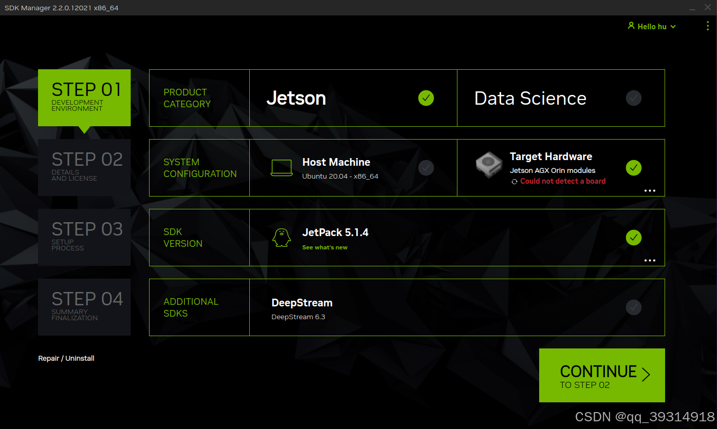 sdkmanager Target Hardware会自动检测适配Jetson硬件,以及SDK版本,点击CONTINUE