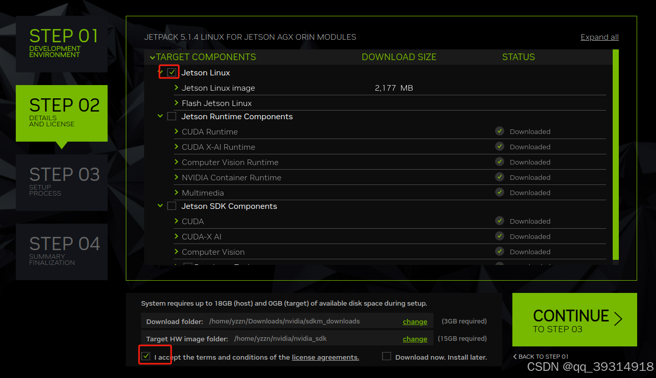 sdk一起安装容易失败,试过很多次一次没有成功,换版本也不行,最后分开安装,只勾选系统Jetson Linux,勾选accpet接收,点击继续CONTINUE
