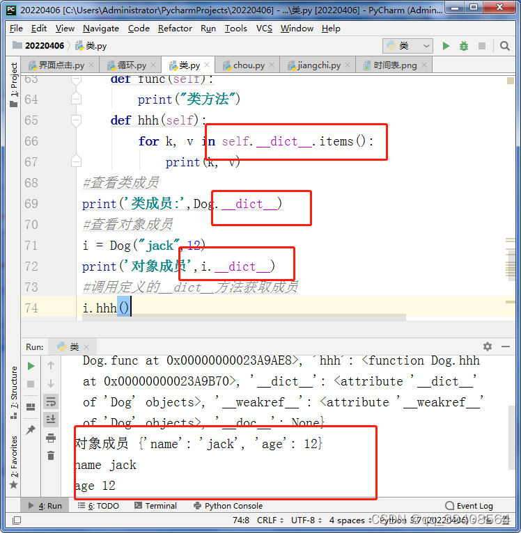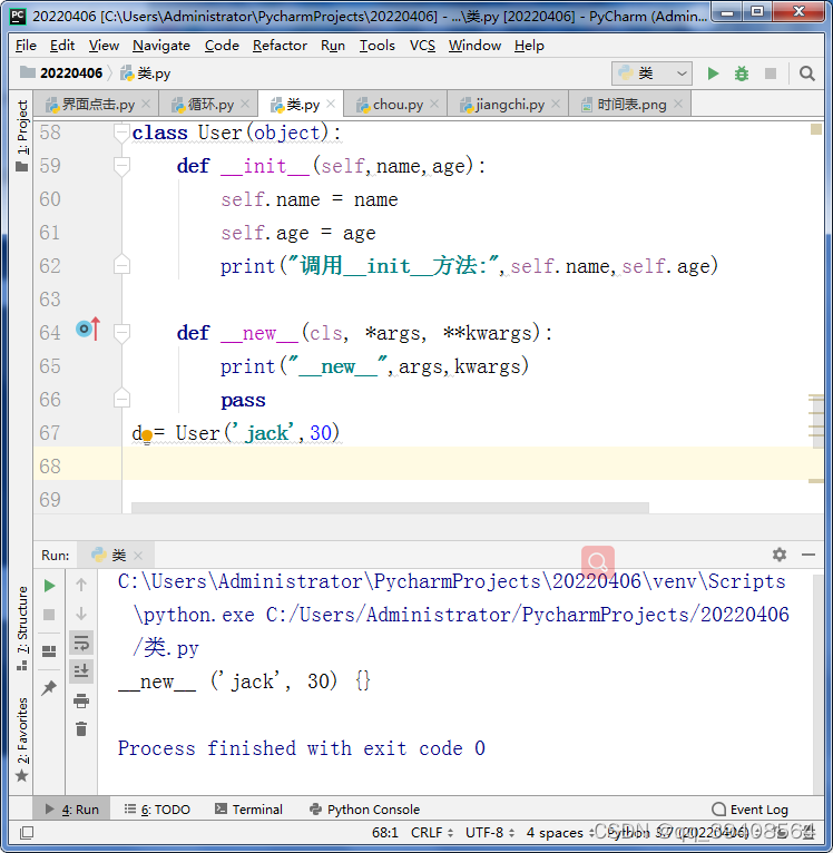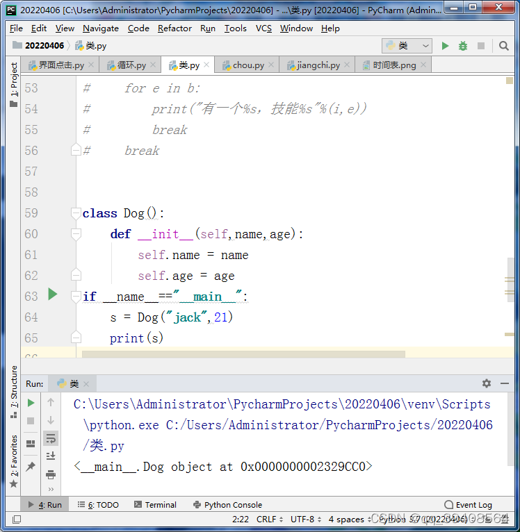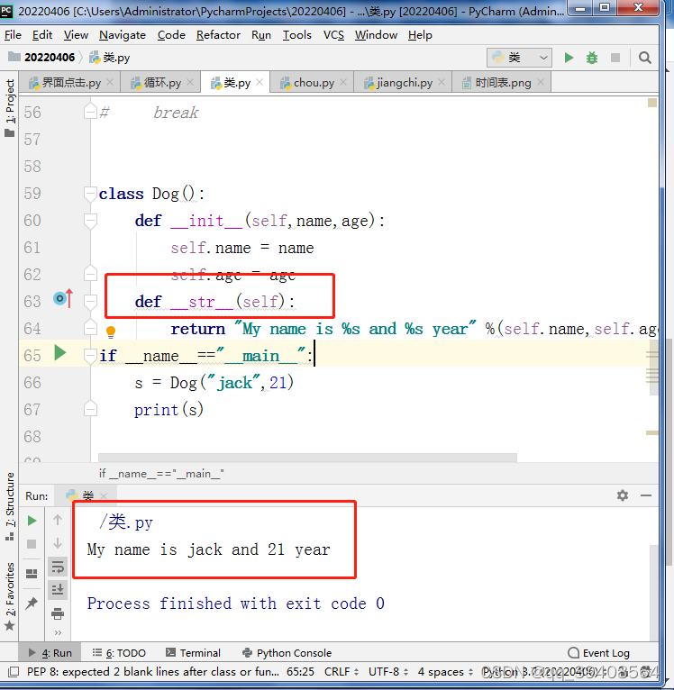 总结:实例化对象时会调用__str__()方法,如果没有定义__str__()方法会打印一个对象的地址,如果定义__str__()并且有返回值,就会打印其中的返回值