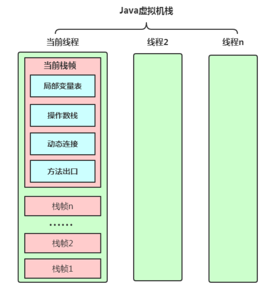 - 虚拟机栈:存储方法调用时的局部变量表,操作数栈,动态链接,方法返回地址等信息。